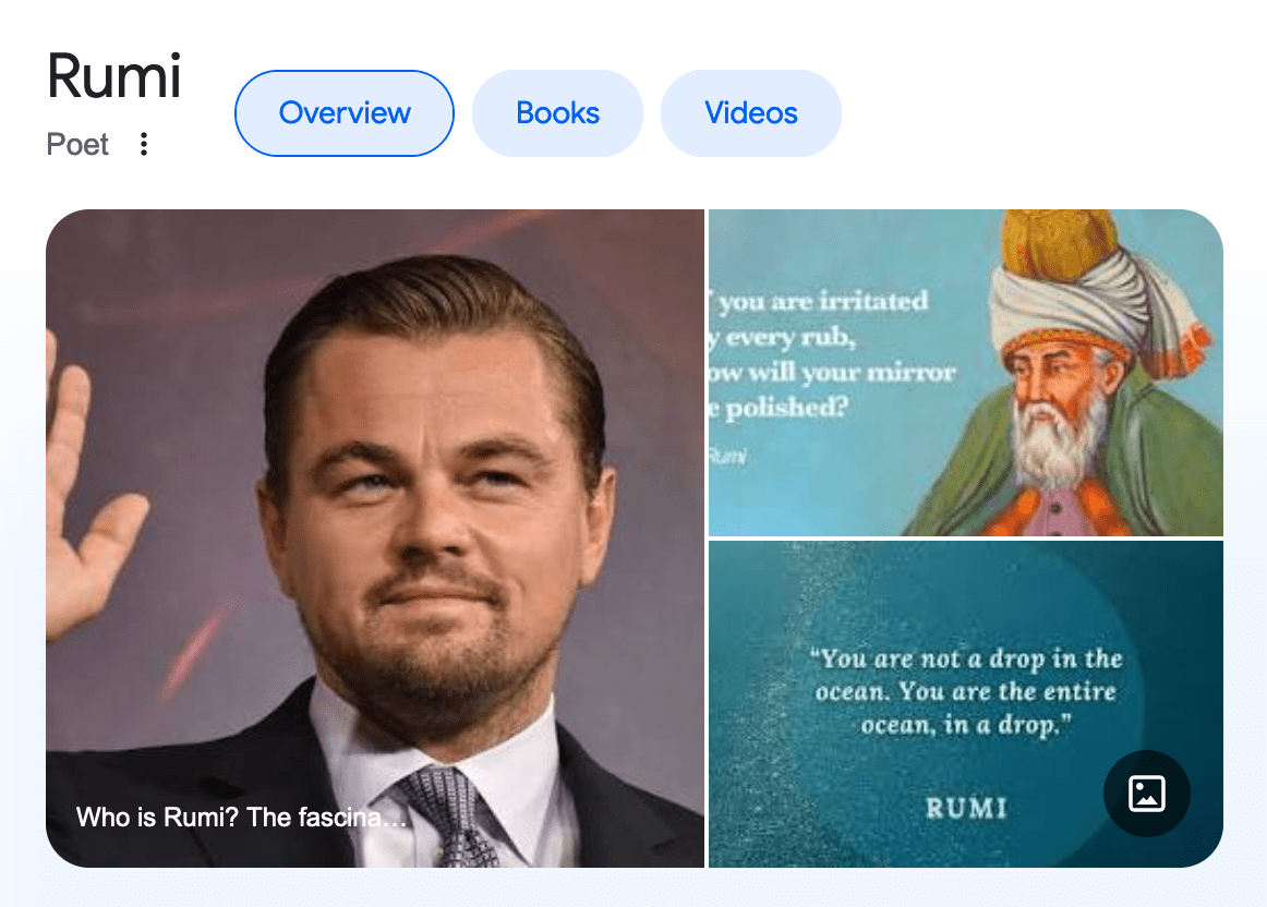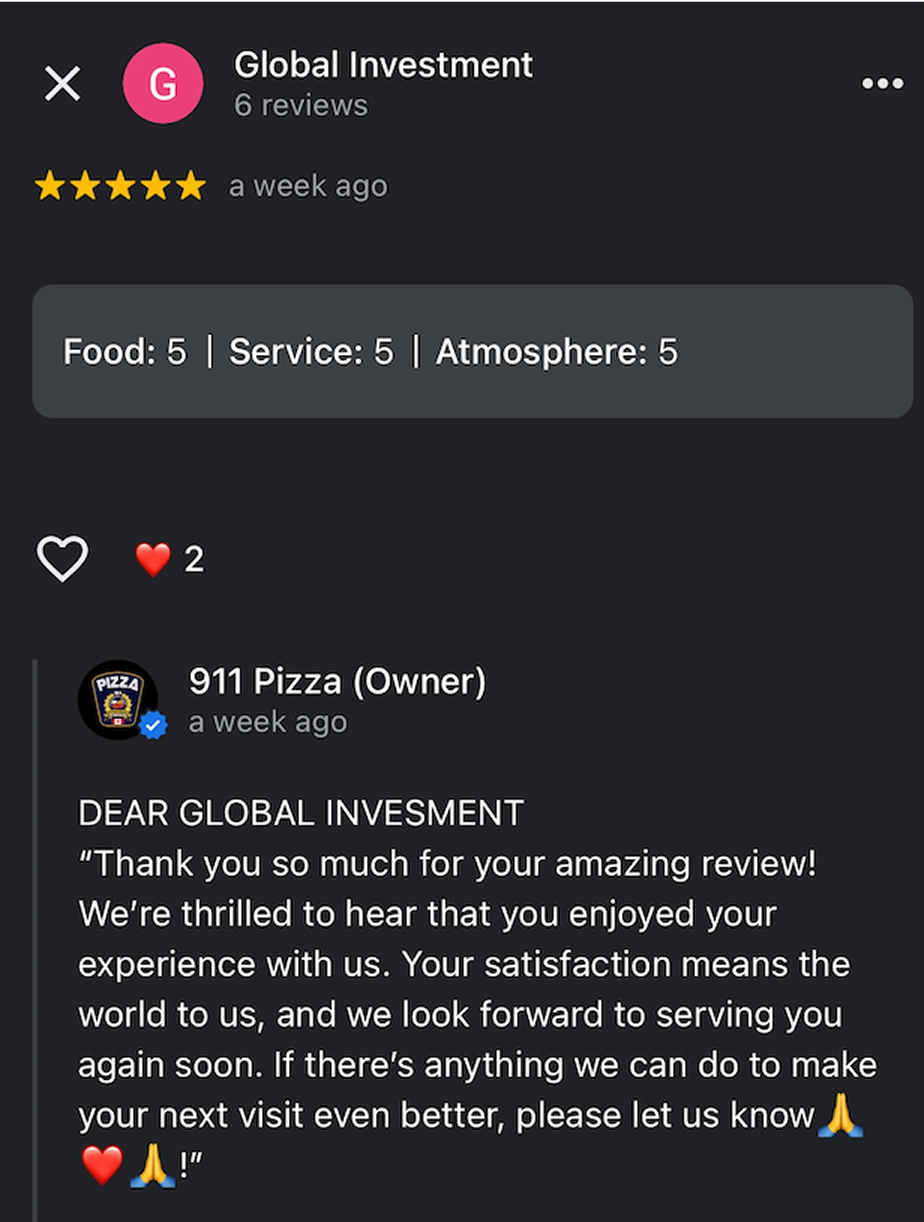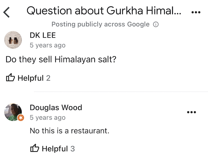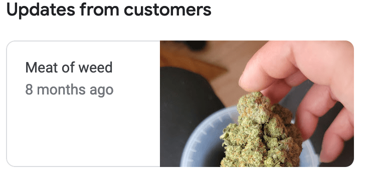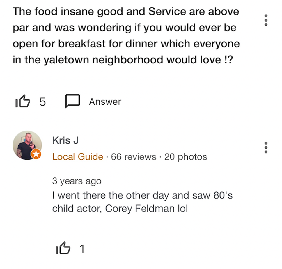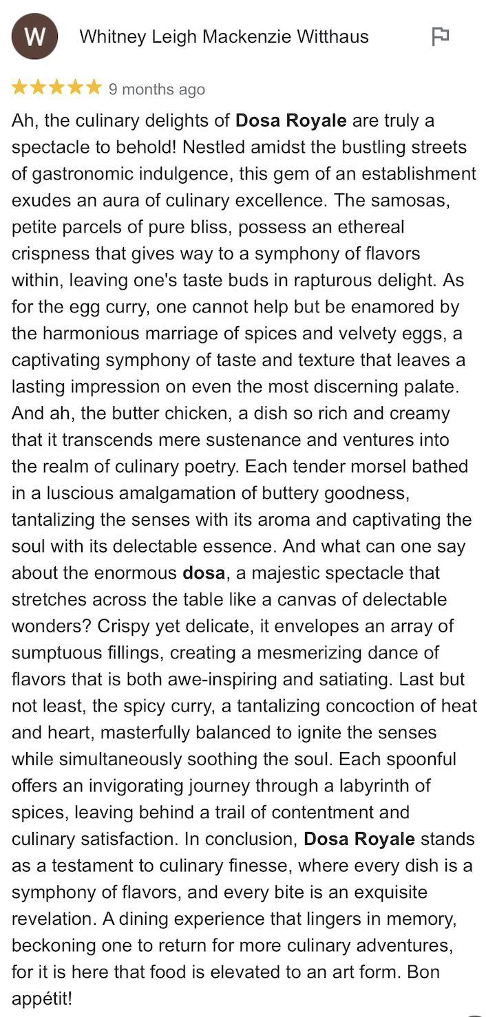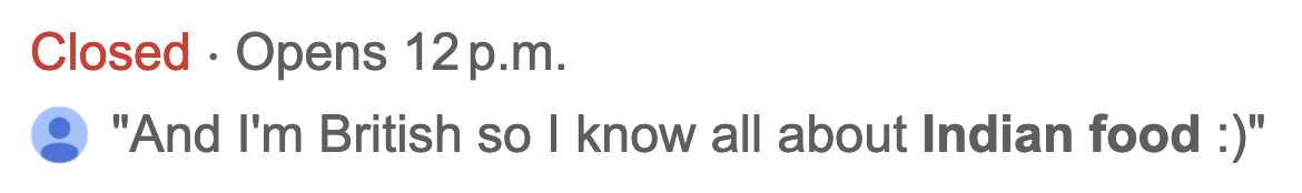 screenshot of a google panel of 'customer updates' with an image of a man staring down at his food with claw-like hands and awesome head attire saying 'extremely good food!!!! we stuffed ourselves like 2 fat'