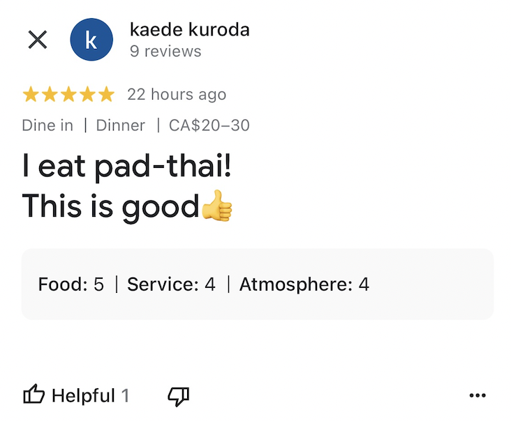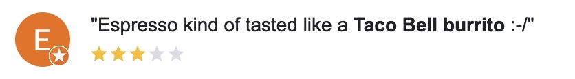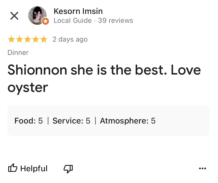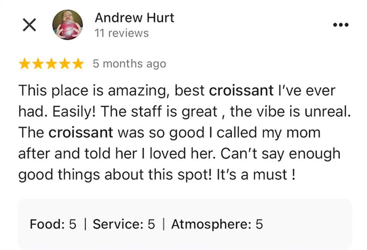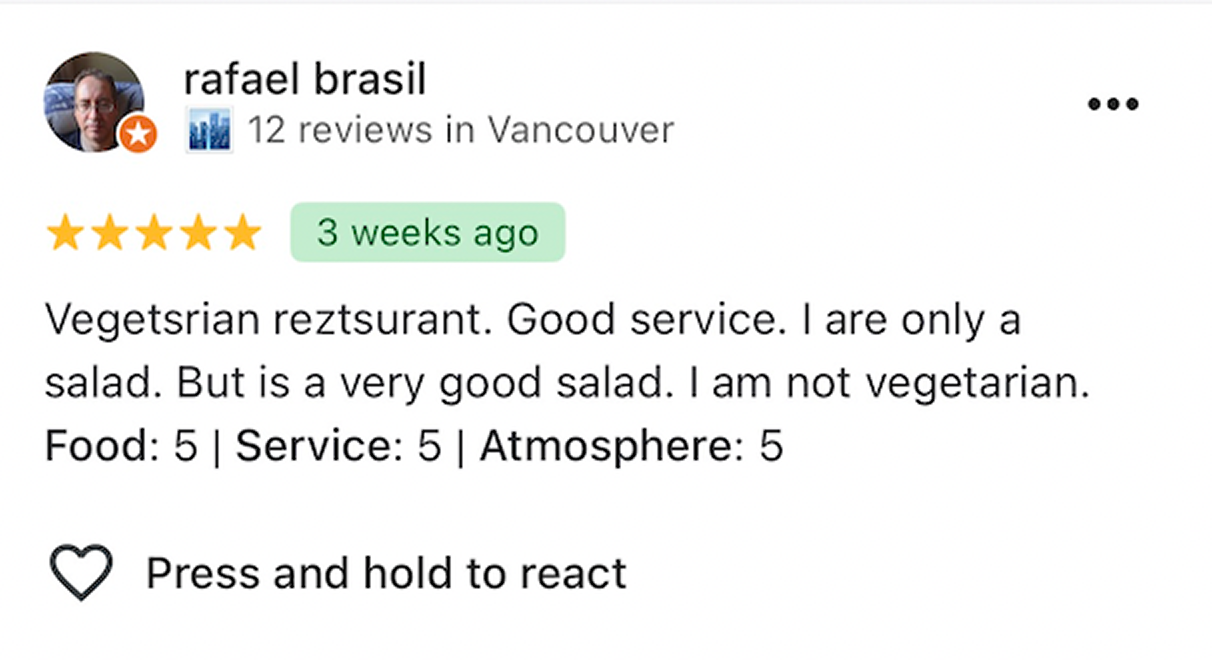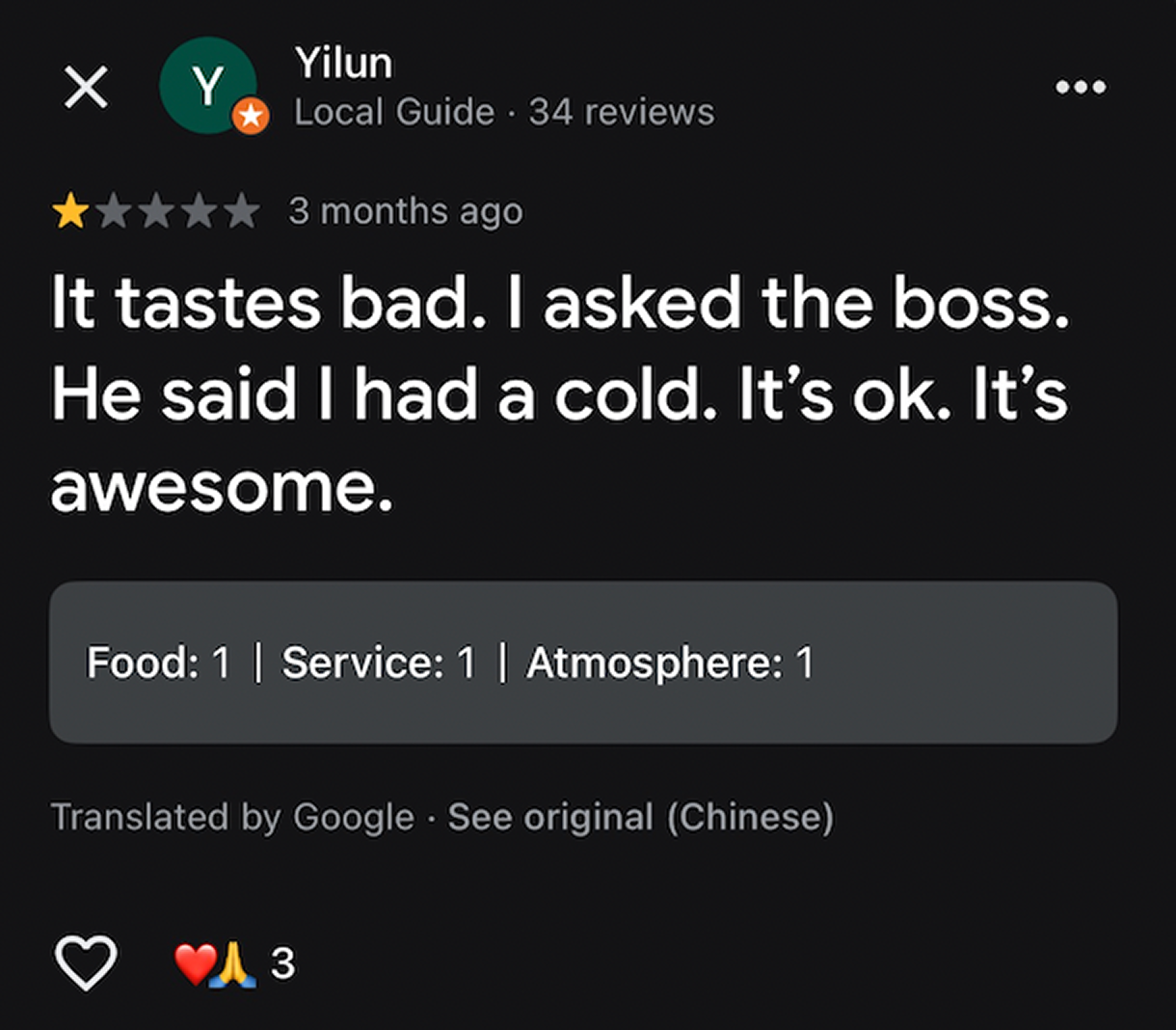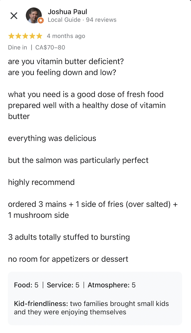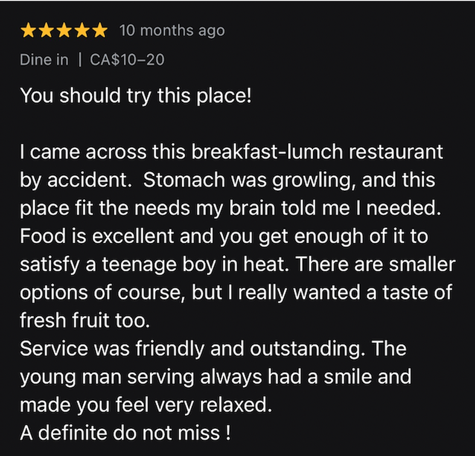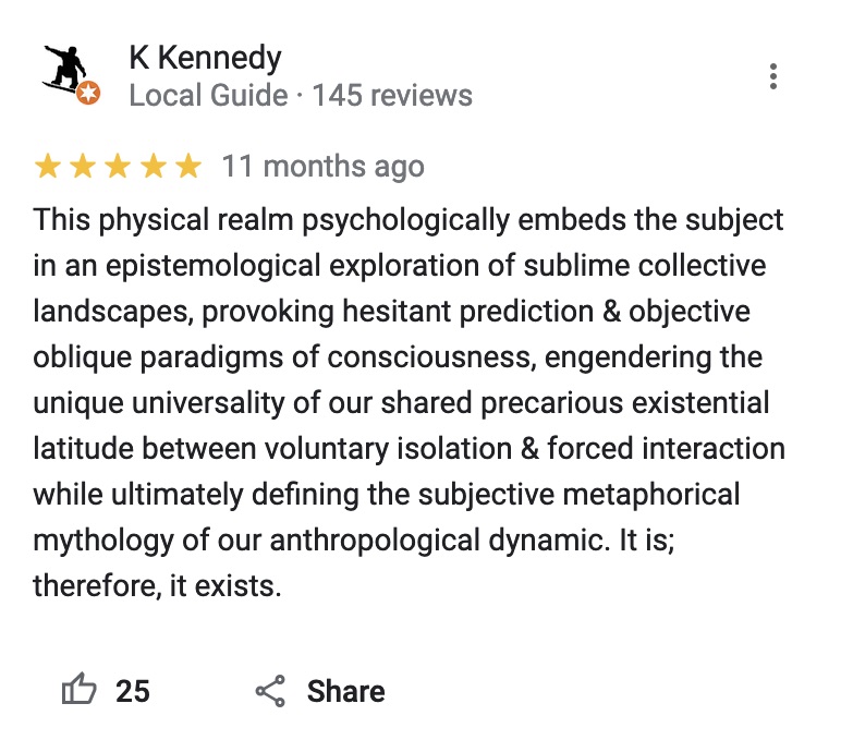 screenshot of a google review reading '7 months ago i took a lot of accidental live photos here, i would have preferred stagnant. i just wanted to capture one moment, i didn't need any of the moments leading up to that one moment. i'll smile for photos because i want to believe i'm happy in most moments of my life. live photos are showing me that sometimes i look miserable right before smiling. anyway, at least food doesn't change much with live photos. it looked and tasted great.'