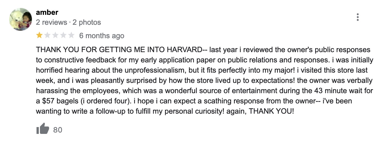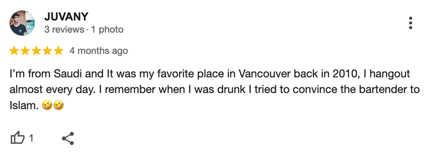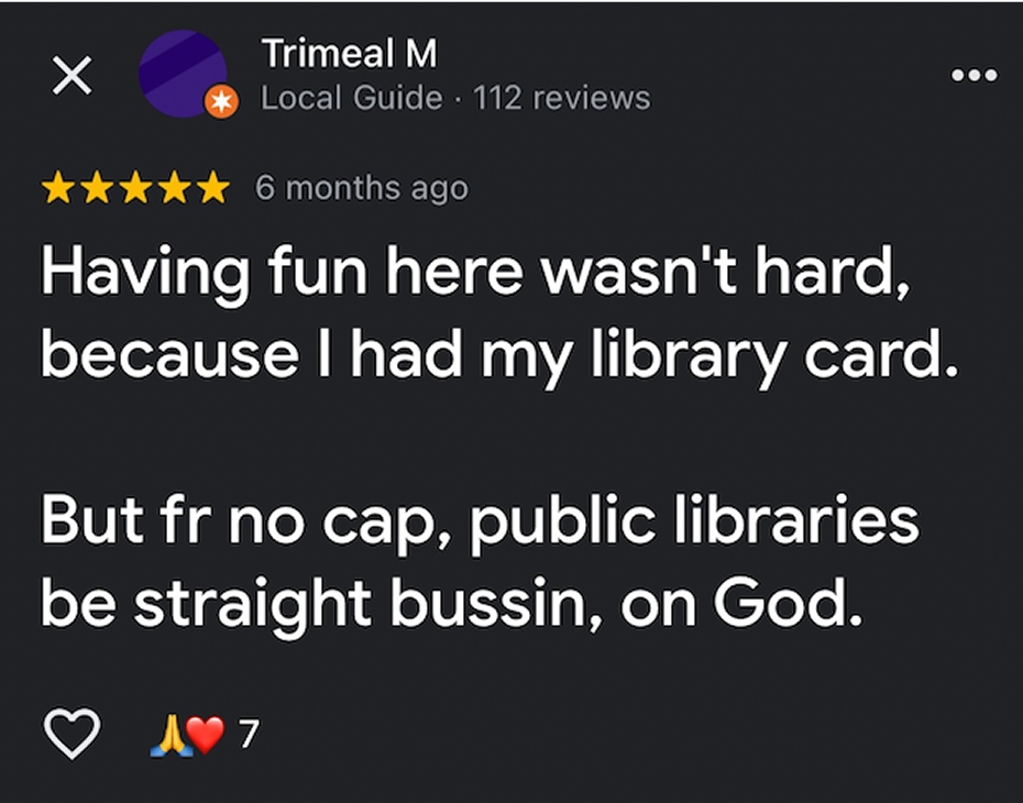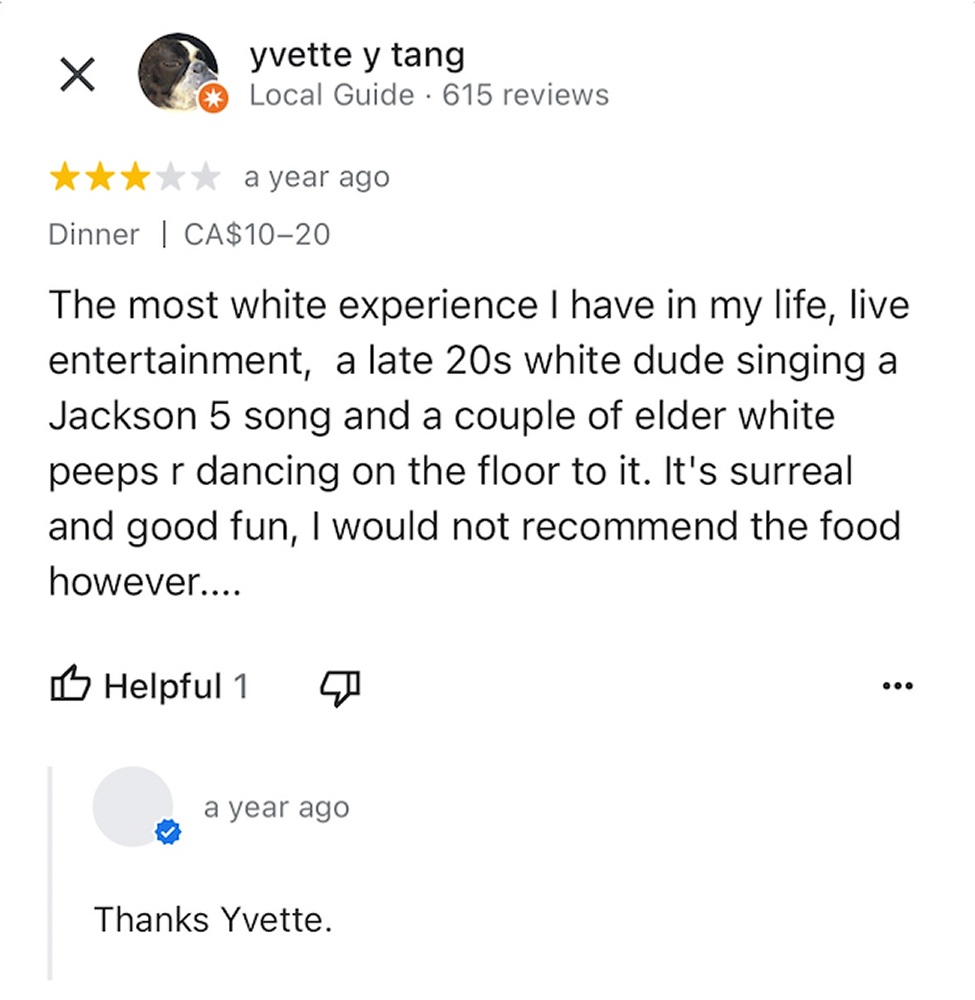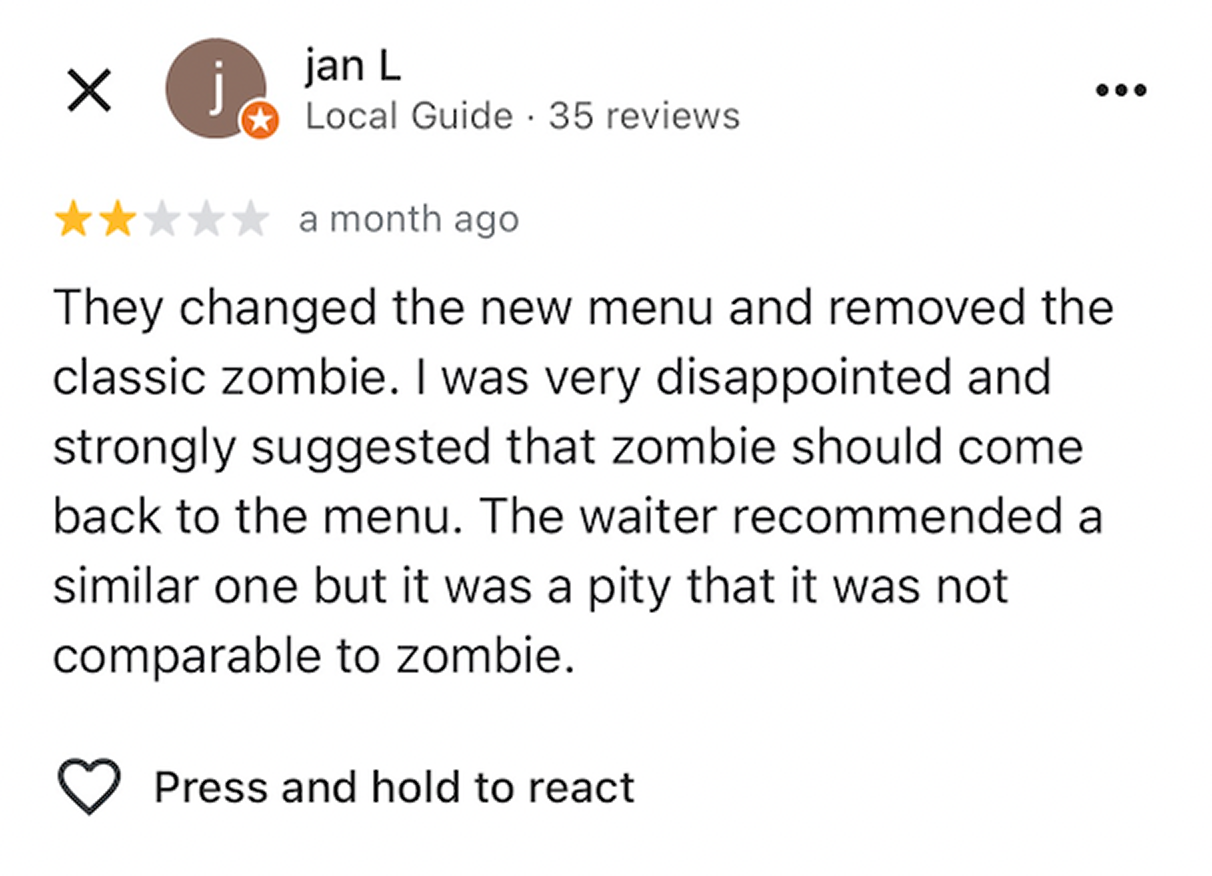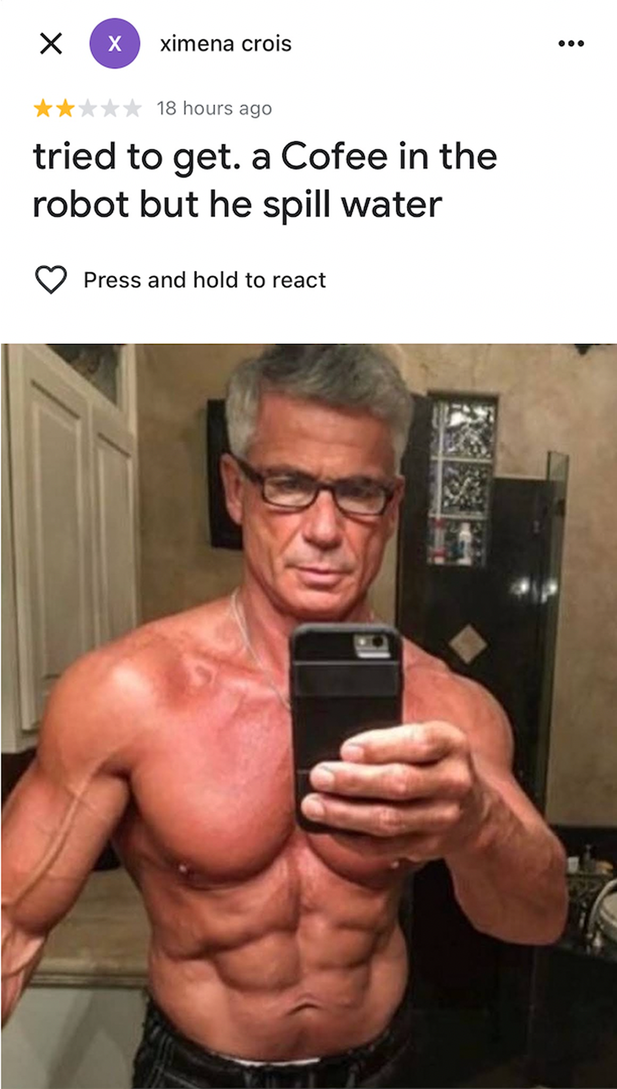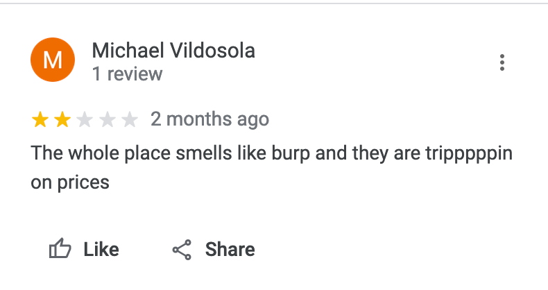 screenshot of a google review reading '7 months ago i took a lot of accidental live photos here, i would have preferred stagnant. i just wanted to capture one moment, i didn't need any of the moments leading up to that one moment. i'll smile for photos because i want to believe i'm happy in most moments of my life. live photos are showing me that sometimes i look miserable right before smiling. anyway, at least food doesn't change much with live photos. it looked and tasted great.'