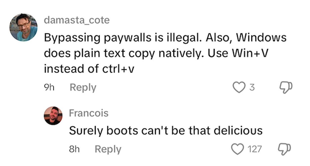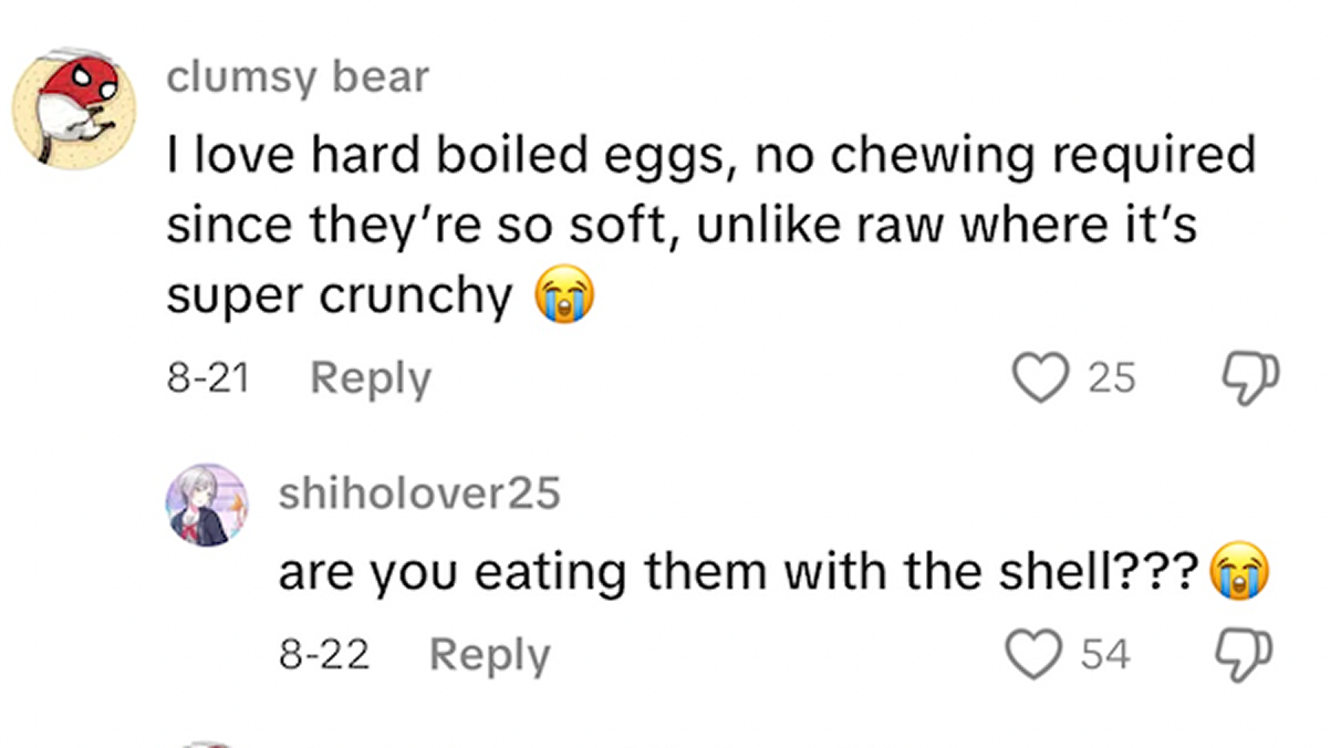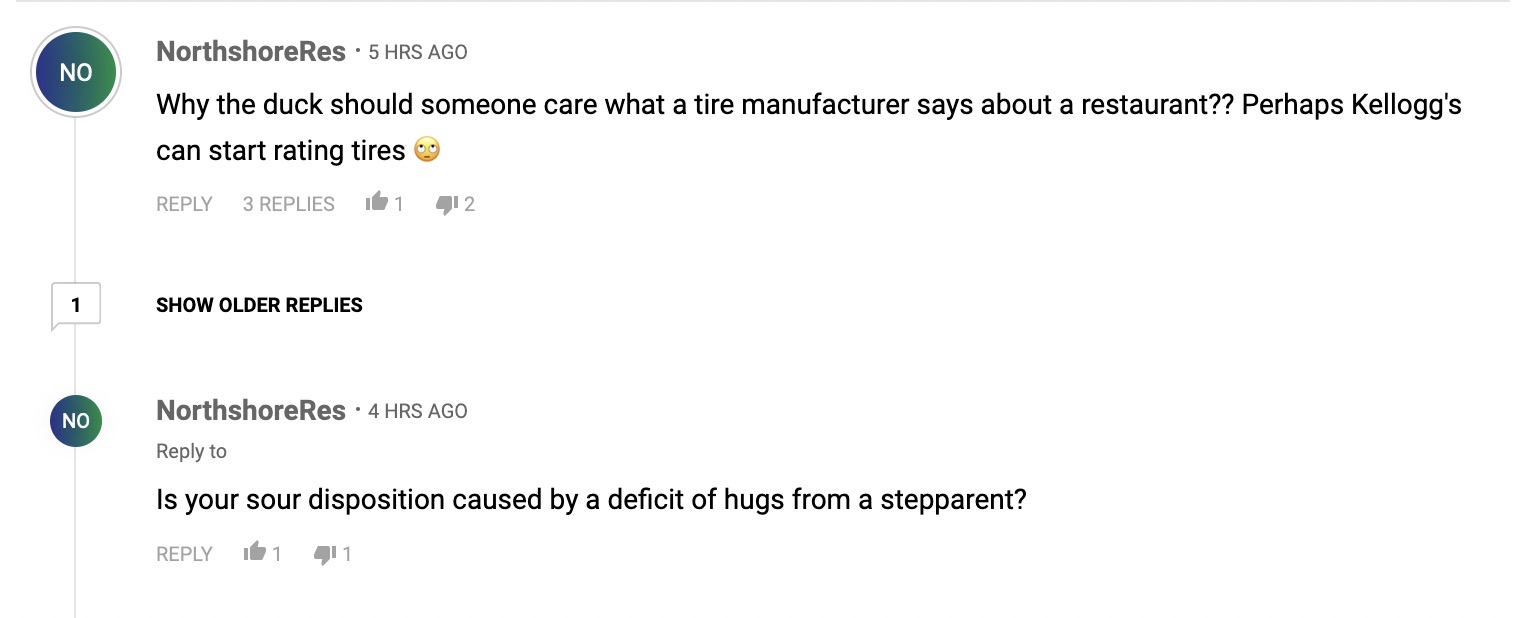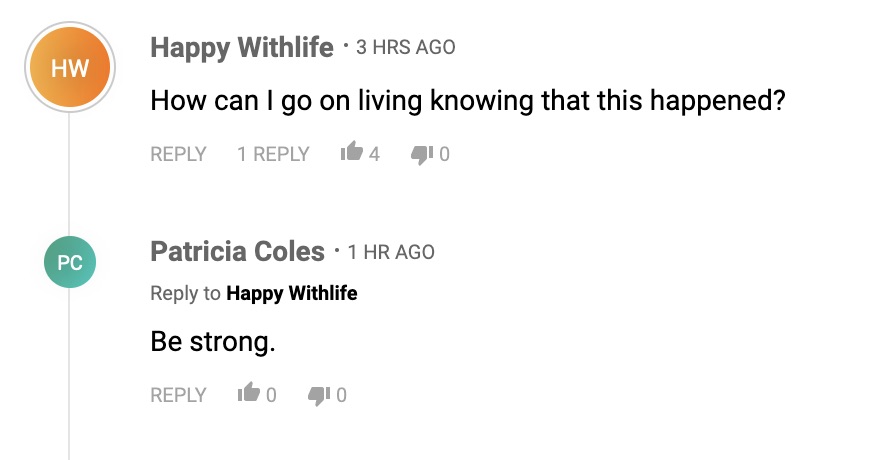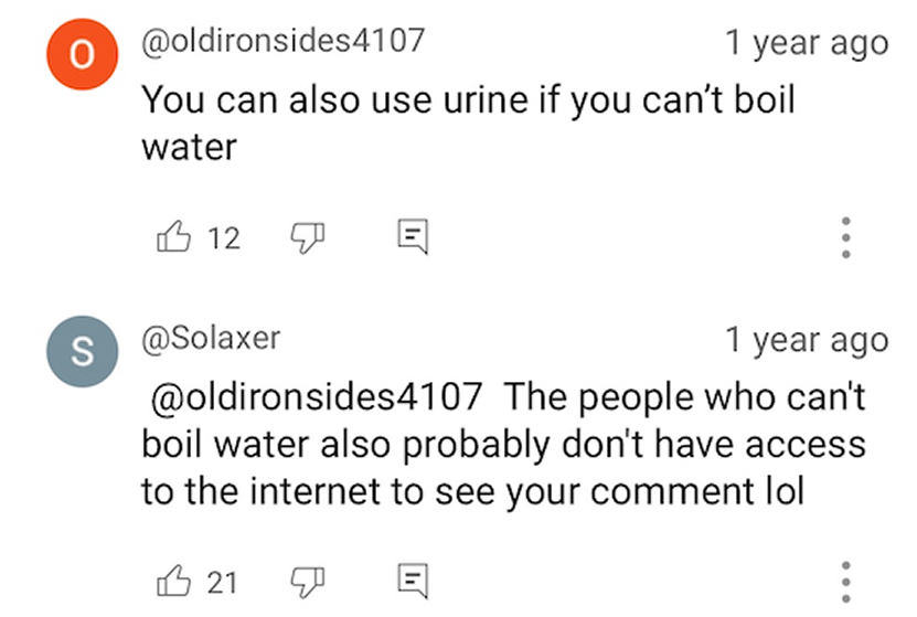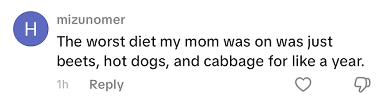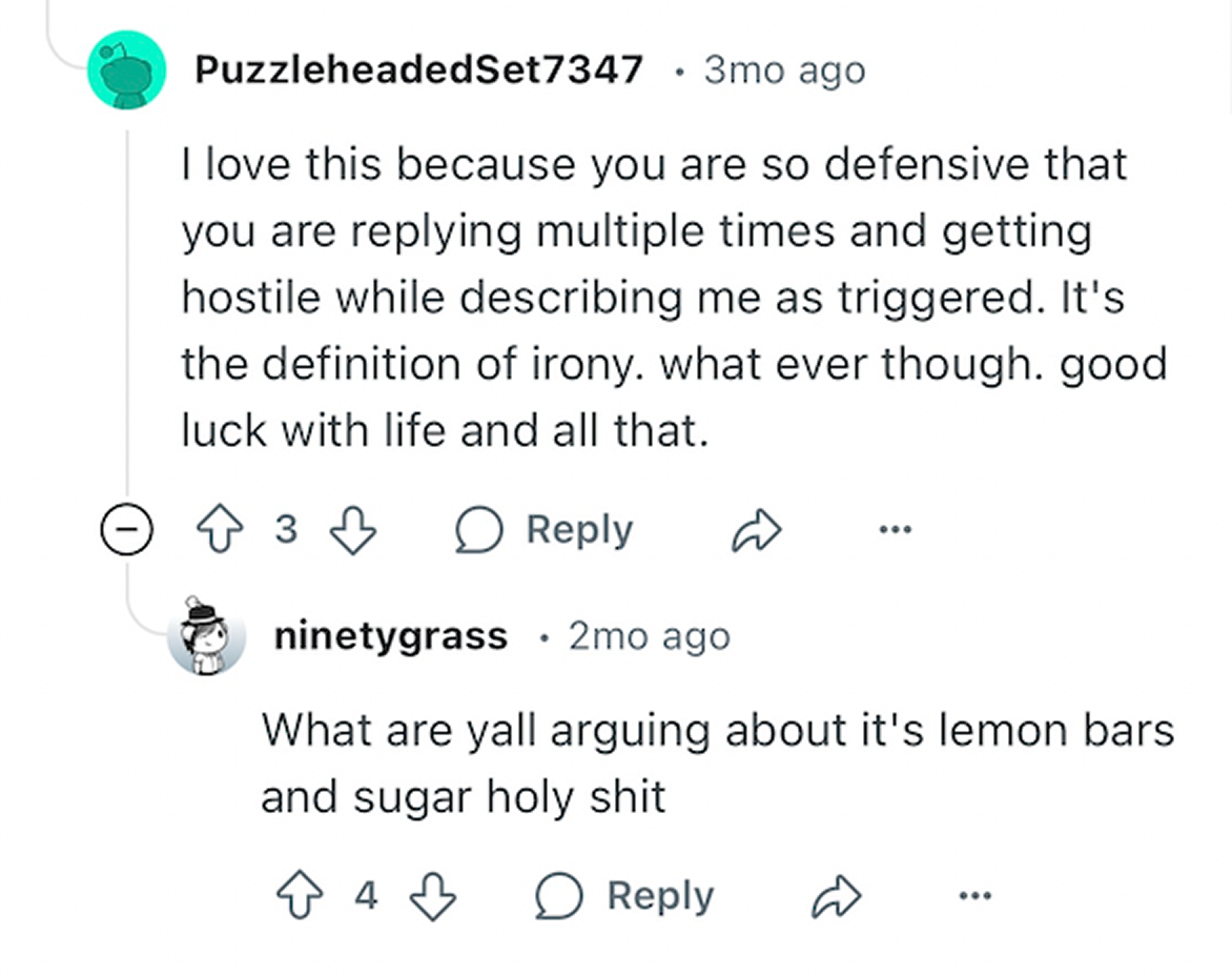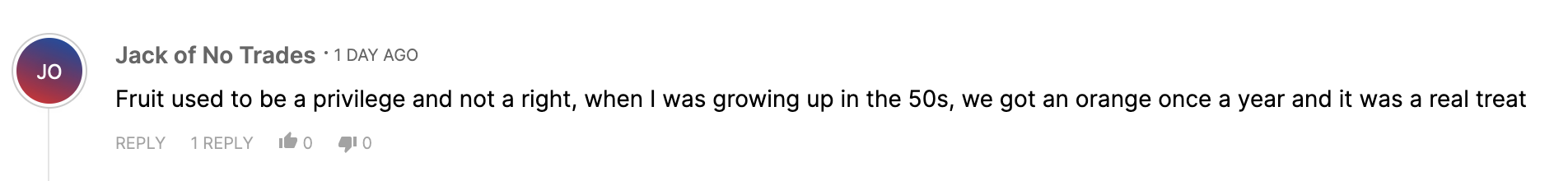 screenshot of a news comment thread with one person saying 'BUY A BAG OF FLOUR, A BAG OF RICE AND A BAG OF BEANS. CARROTS, CANNED TOMATOES, POTATOES. SNOBS FORGET HOW HEALTHY IT IS TO EAT LIKE A PEASANT. NO PROCESSED FOODS.' and the reply being 'why are you yelling?'