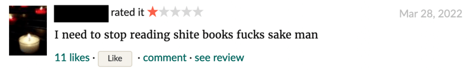 screenshot of a goodreads review that says 'this book is about a man in ww2 he gets erections' in all caps